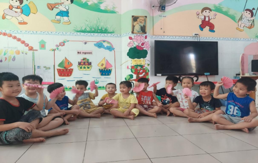 Trẻ làm quạt từ giấy.